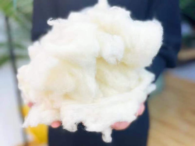 こちらはウールの糸になる前段階の整毛(原毛から汚れや糸の選別が終わった状態)です。見て下さい、このボリュームとフワフワ感。