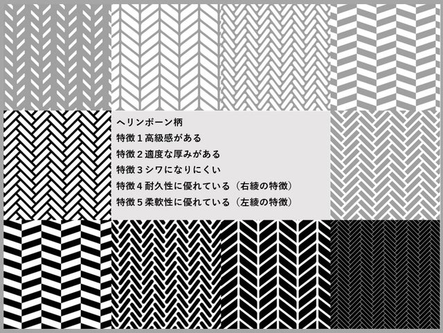 ヘリンボーンとは、模様の名称のことで、見た目が開いた魚の骨に似ていることから「ニシンの骨(Herring bone)」と呼ばれています。ヘリンボーン模様の作り方には、いくつかの種類がありますが、織物では「右上がりの綾織り(右綾)」と「左上がりの綾織り(左綾)」を交互に組み合わせた「V字型」が主流です。そのため、右綾の丈夫さと、左綾の柔らかさの両方を兼ね備えているのが特徴です。天然繊維から合成繊維まで、さまざまな素材のヘリンボーンがありますが、その中でもウールを使った生地が有名で、秋冬の衣料品に使われることが多い生地です。