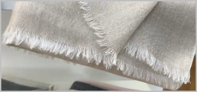薄くてフワっとストールを作り上げるには細い糸を作り、そこに織機に耐えるように水に溶ける糸をウールの細い糸に巻き付けて、しっかりさせて織る手間をかけ、技術を掛けた方法です。写真のストールの端を見て下さい。フリンジ先はたて糸が出てますが少し縮れる感じの細い糸非常に繊細です。織りの間に小さな空間が生まれ、そこに空気を含み、ふんわり感を引き出し、巻いた時ふわっと感じられるようになってます。フェザーウールストールを是非体感してみて下さい。
