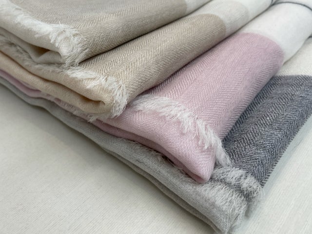 そこで私たちは極細ウール糸を使い表面がフワっと感じるヘリンボーンの織りにこだわりました。フワっと柔らかく、軽い 称して【フェザーウールストール】です。