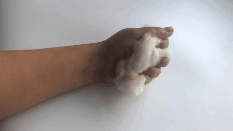 お洒落度UP暖かさUP本来持つカシミヤのフワっとを引き出す糸への特殊加工がすごいこちらはカシミヤの糸になる前段階の整毛(原毛から汚れや糸の選別が終わった状態)です。見て下さい、このふわふわ、もふもふの感じ。雲のような整毛ですね。