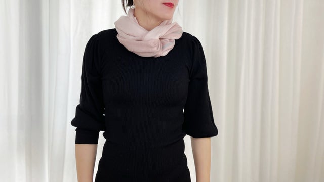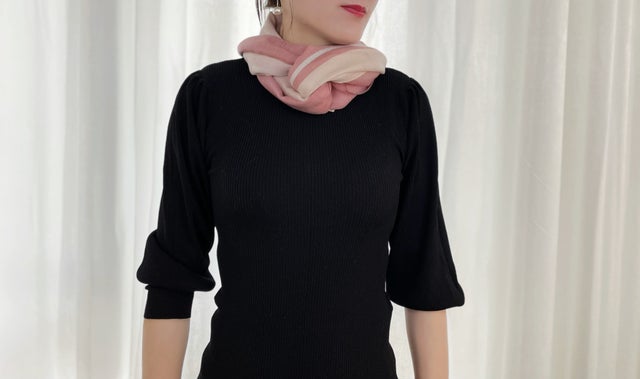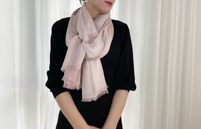ストール半分をピンク、もう半分をオフがベース。ラメ色はシルバーで、巻いた時にピンクとオフが重なり合い淡いトーンで首回りが明るくなります。