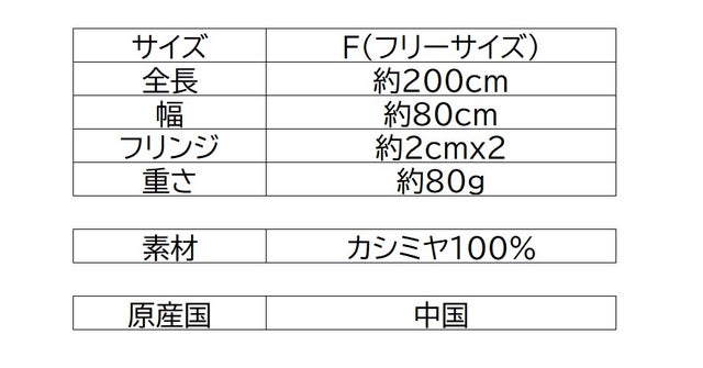 サイズは幅約80cmx長さ約200cmで巻いて、羽織って、掛けて使い方自由自在サイズ。繊細で柔らかいカシミヤ200番双糸は、約80gと軽く持ち運び様々なシチュエーションでご使用いただけます。シャツに、Tシャツにコートインまで使えるようにかさばらなく薄く仕上げ、色は合わせやすい3色を企画。
