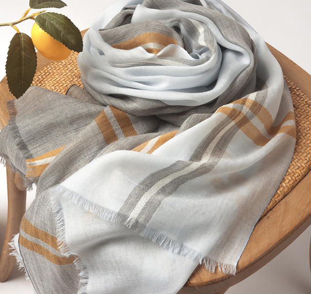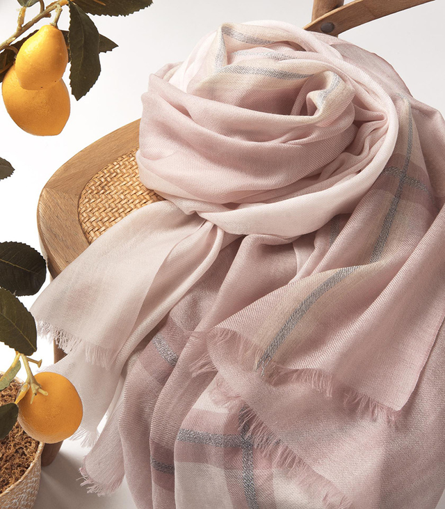 気温の寒暖差があるこの時期は、朝晩と日中の服装に悩みますよね。そこでこの時期1枚持っていればとても便利なカシミヤ、春先から秋口まで使えるカシミヤストールの企画をスタートしました!また、無地ではなく少しデザインを利かしてチェック柄。アクセントにラメ糸を入れて、いつものコーデに上品さUP!