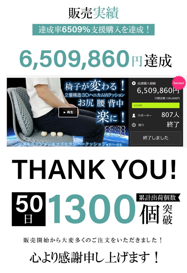 ハニカム【Honeycomb蜂の巣】正六角形立体メッシュが上層下層合計約2000個以上のコズモ(宇宙)クッションと上層下層合計約1000個以上のコズモ(宇宙)ランバー(腰)クッション! 2重3D立体構造ハニカムが全面で体圧を分散しているから割れないのです!ご覧ください!腰背中お尻、しっかりフィットしてます!ランバー(腰)クッションがぷるぷると揺れてます!お尻は沈んで椅子自体に触れることはありません。これは軽く感じ楽です!コズモ無しでは座れなくなります。冒頭にて応援サポーター様のお声をご紹介させていただきましたが、大変うれしく有難い応援コメントを多くいただいております。