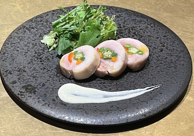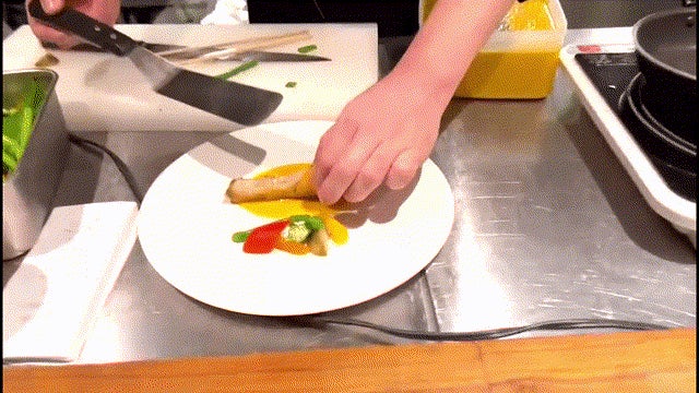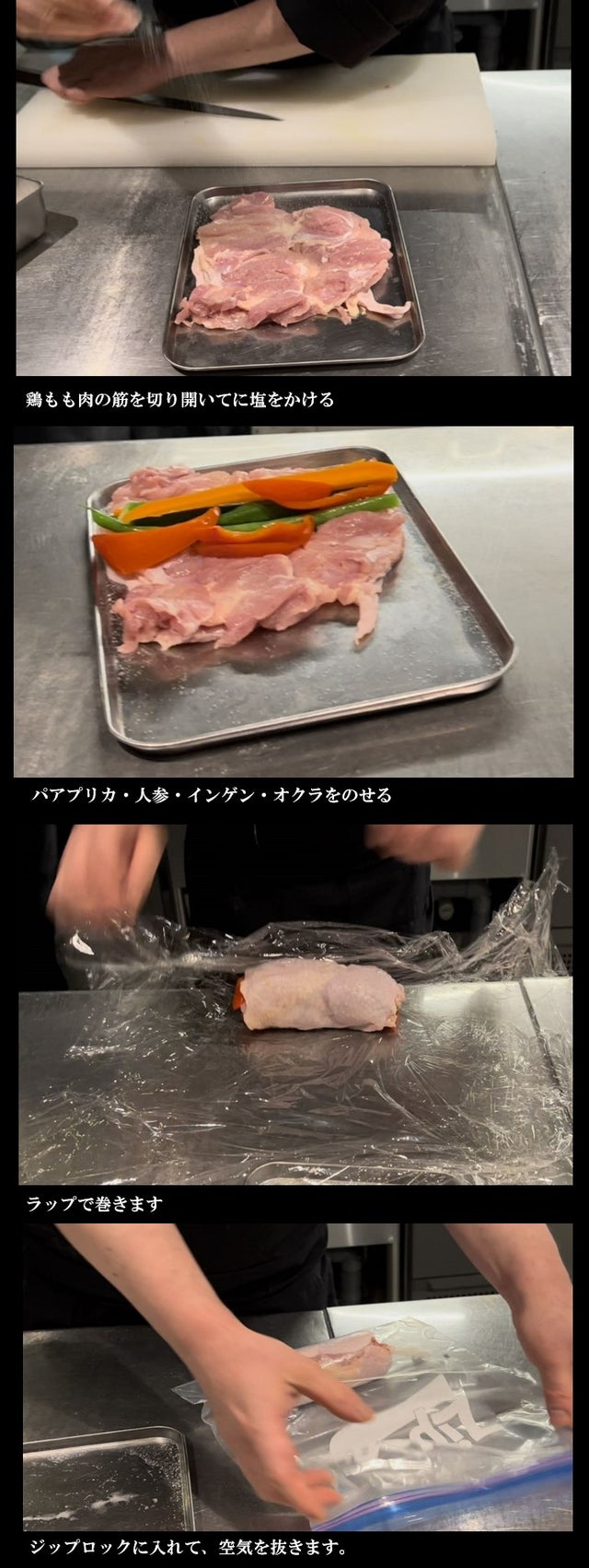 低温調理法(=真空調理法)の起源は1979年フランス、ジョルジュ・プラリュによりフォアグラのテリーヌの調理のため開発された調理法とされてます。しかし、この低温調理法をご存じの方は少なくはないと思います。簡単に説明しますと、いつもスーパーで購入する食材が、驚きの『柔らかさとうまみ』を堪能することが出来る調理法です。 ご覧ください!色鮮やかな野菜を巻いた鶏もも肉のしっとり感!