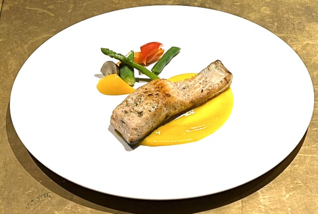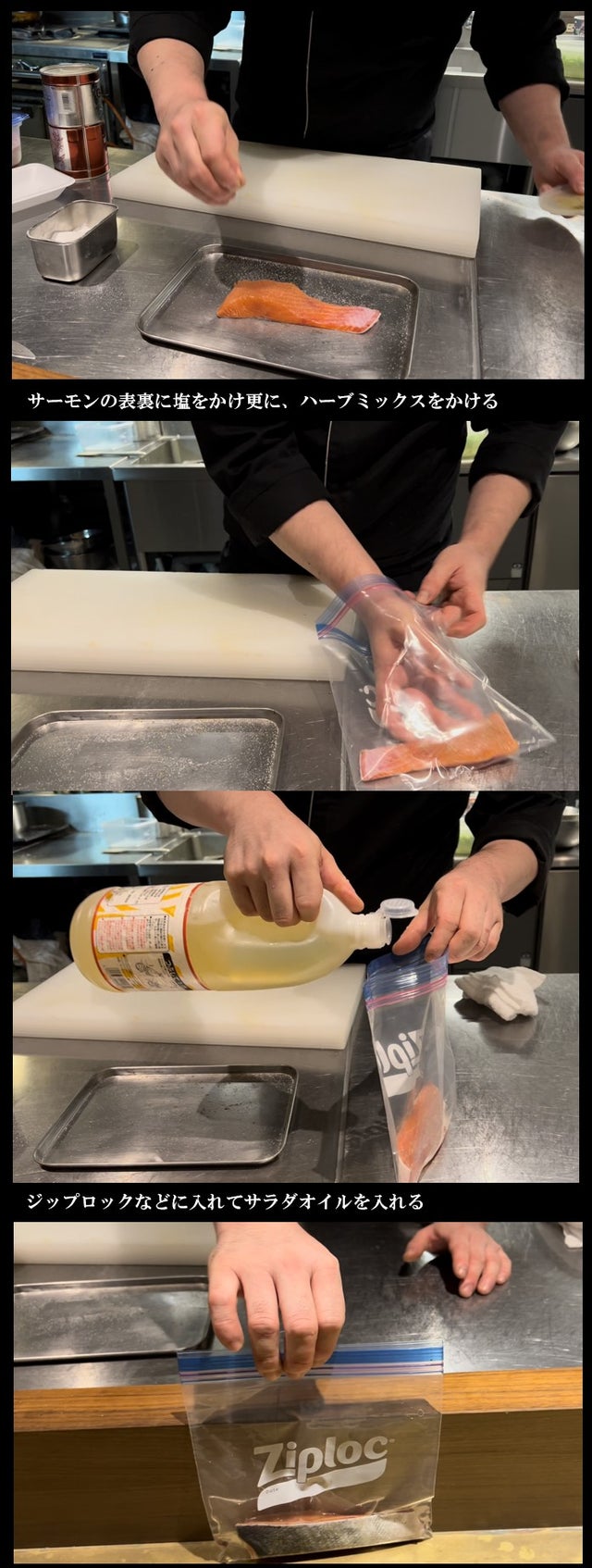 身近なお魚サーモン、こちらは【コンフィ】です。【コンフィ】とはフランスの調理の方法で、オイルに食材を浸し、じっくり煮る調理法のことで、そもそもは冷凍保存技術がなかった時代にお肉の保存方法として取り入れられたものでした。それを低温調理器を使えば、効率よく料理が出来ます!