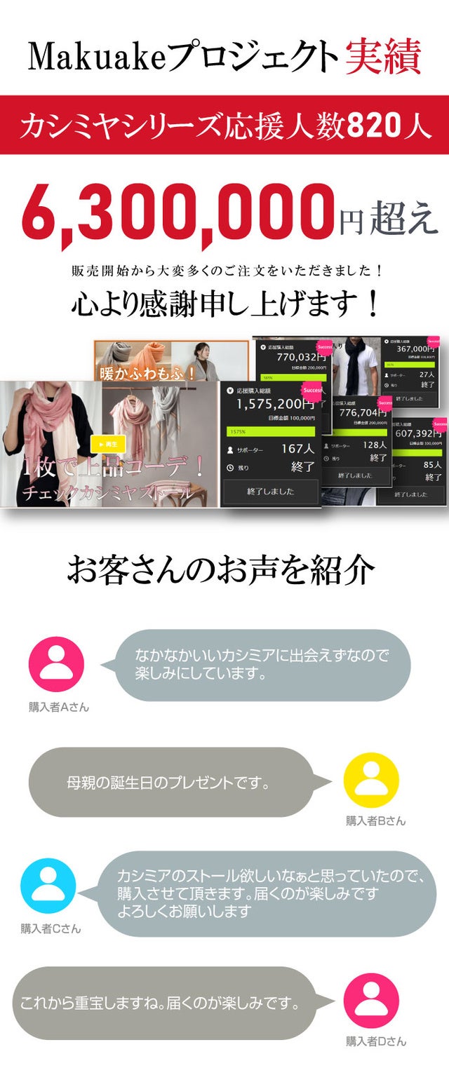 2018年より服飾雑貨、企画開発・生産をしています。今回はベビーウールマフラーを企画しました。長い間様々なブランドのオリジナルを生産しております。私たちのスタートはカシミヤから始まっており、品質、技術、デザイン、価格どれも欠けることなく追及し続けております。現在、アパレル業界全体非常に厳しく、それを生産す工場も同じ状況。そんな時だからこそ、皆様のお力をおかりし、私たちが培ってきたカシミヤの商品、上質な商品を、お求めやすい価格で多くの人に体感して頂きたく企画しております。