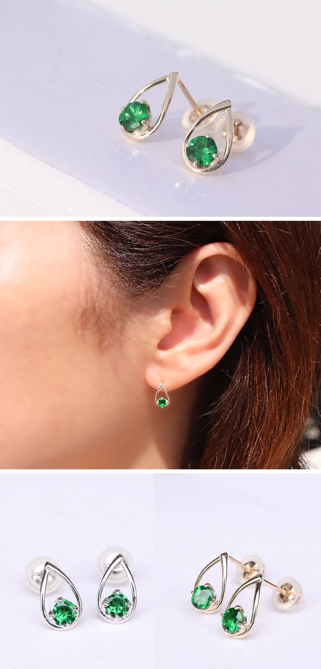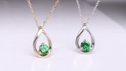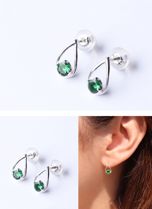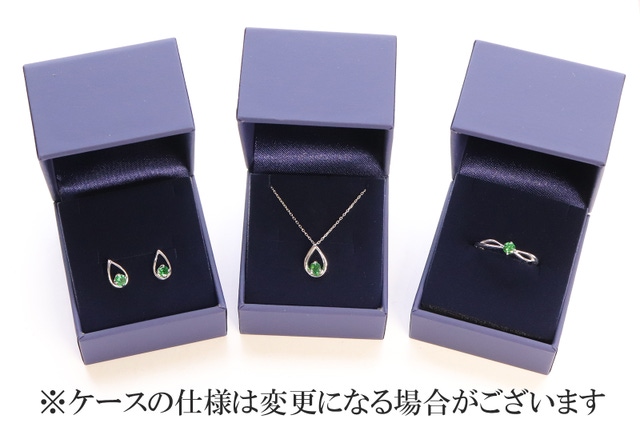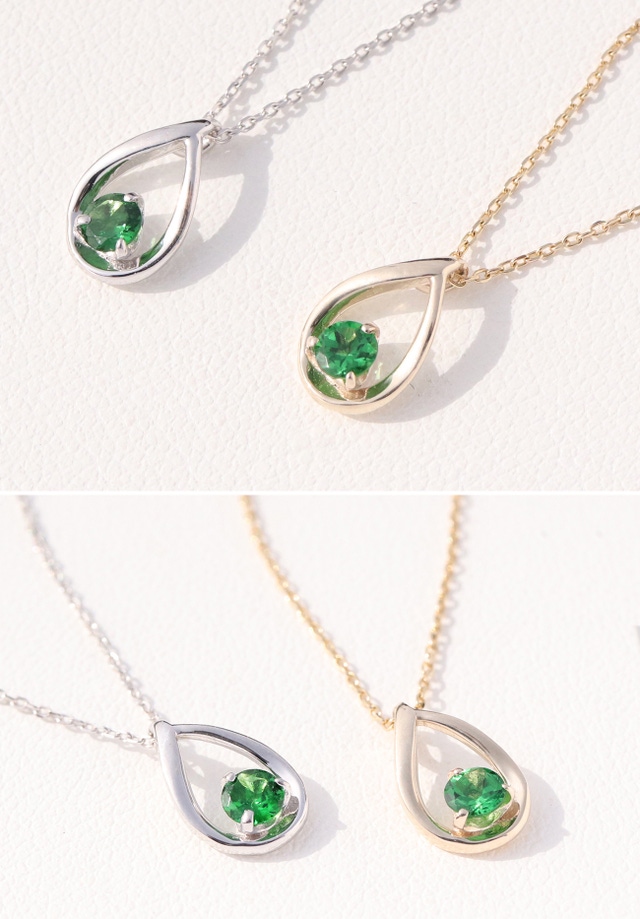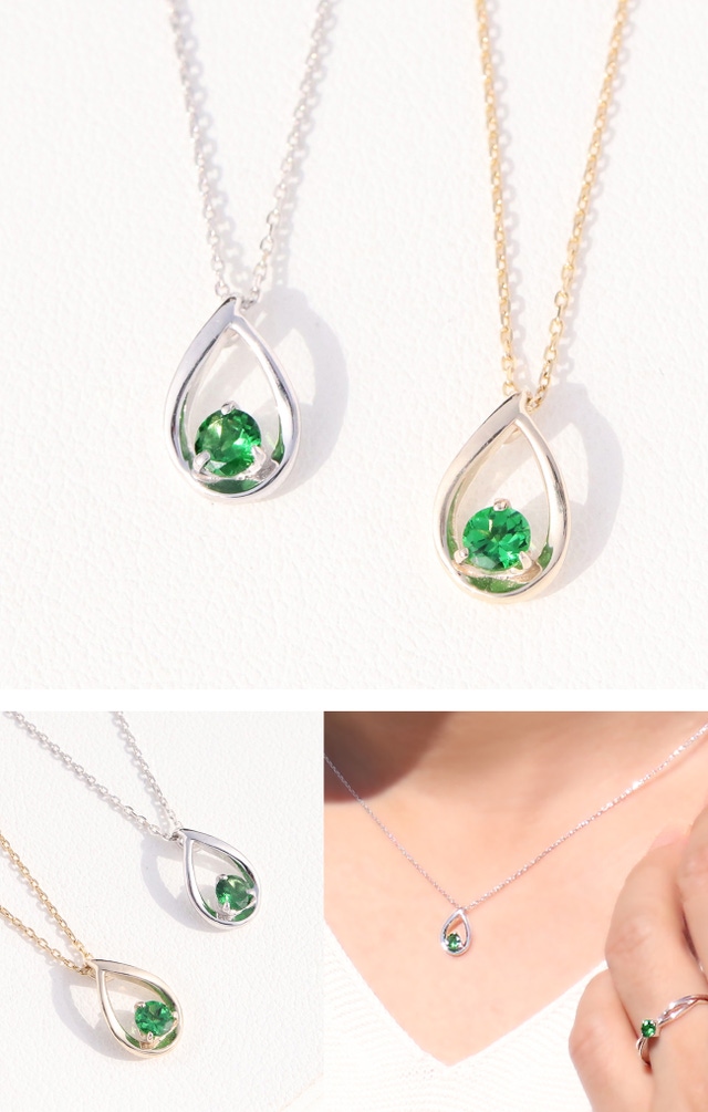 ネックレスとピアスはツァボライトをそっと包み込むようなしずく型のシルエット