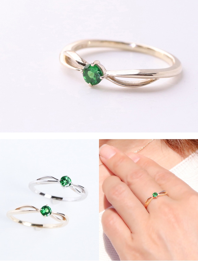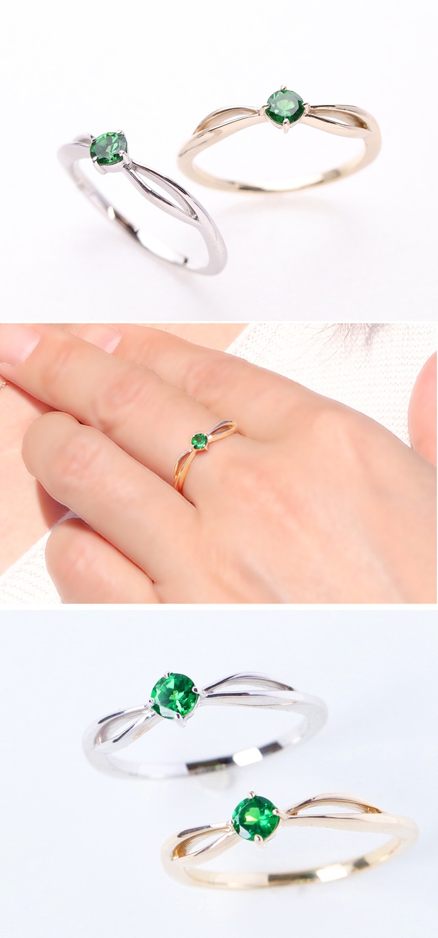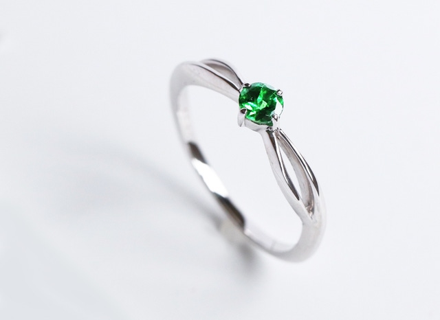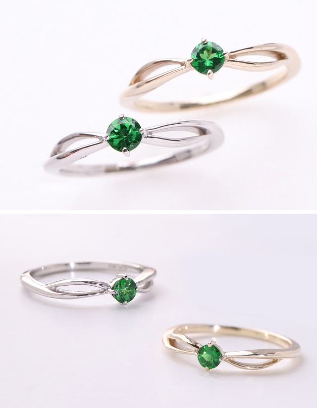 リングは、ツァボライトを中心に2つのウェーブラインをクロスさせたデザインに。