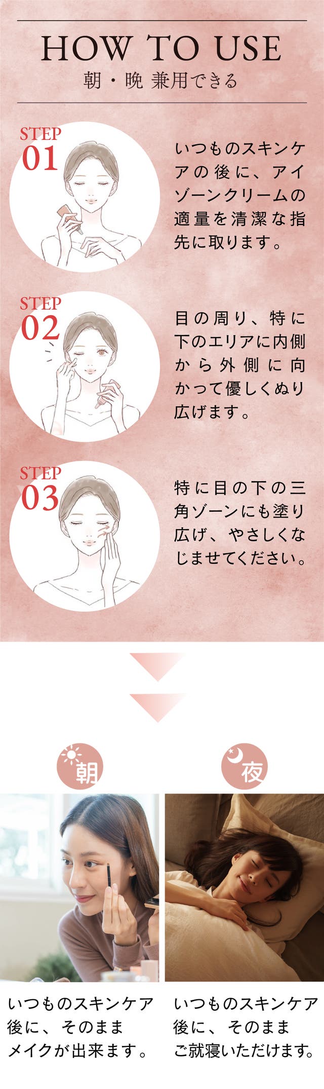目もとのデルタゾーン対策に必要な成分をバランス良く配合することで、ツヤをもたらし、パっと明るい印象に。様々な肌悩みを隠すためのメイク工程が短縮されるので、忙しい朝の時間にゆとりがうまれます。