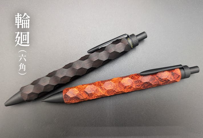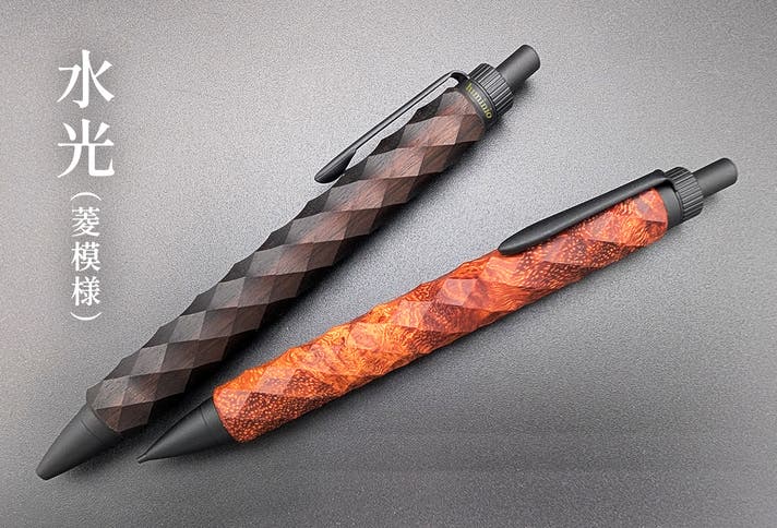 水光(菱模様)、輪廻(六角)という伝統的な文様を、現代の木軸ペンに落とし込む。