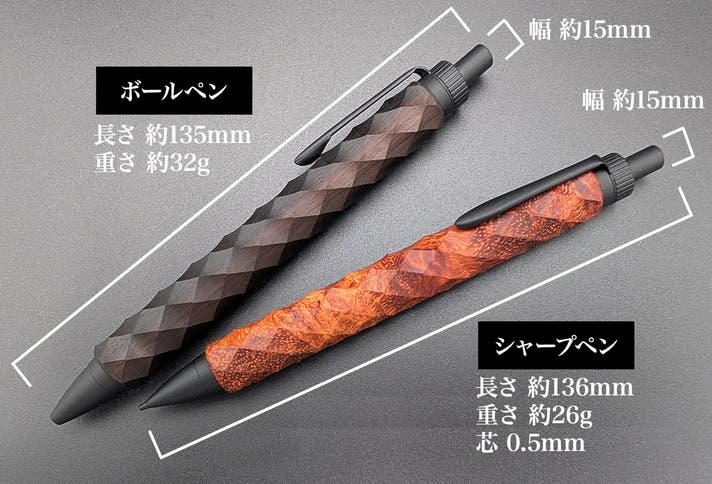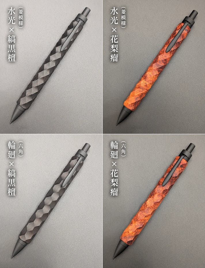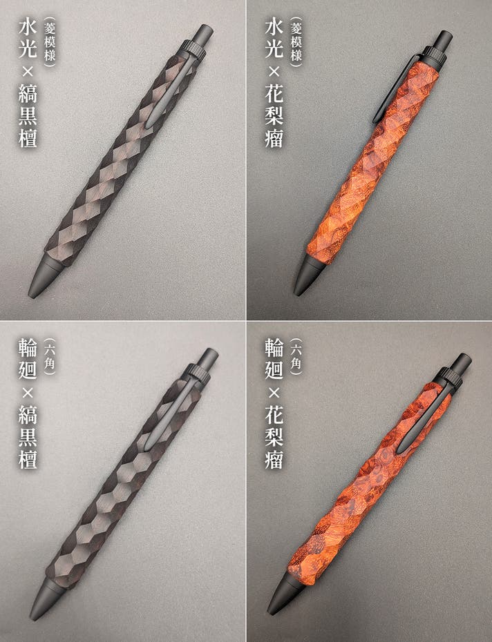 水光(菱模様)、輪廻(六角)という伝統的な文様を、現代の木軸ペンに落とし込む。