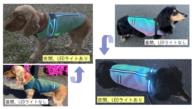 見る方向で色が変わる立体のニット生地で、昼間のお散歩中、LEDライトをつけなくても注目を集めるワンちゃんに!