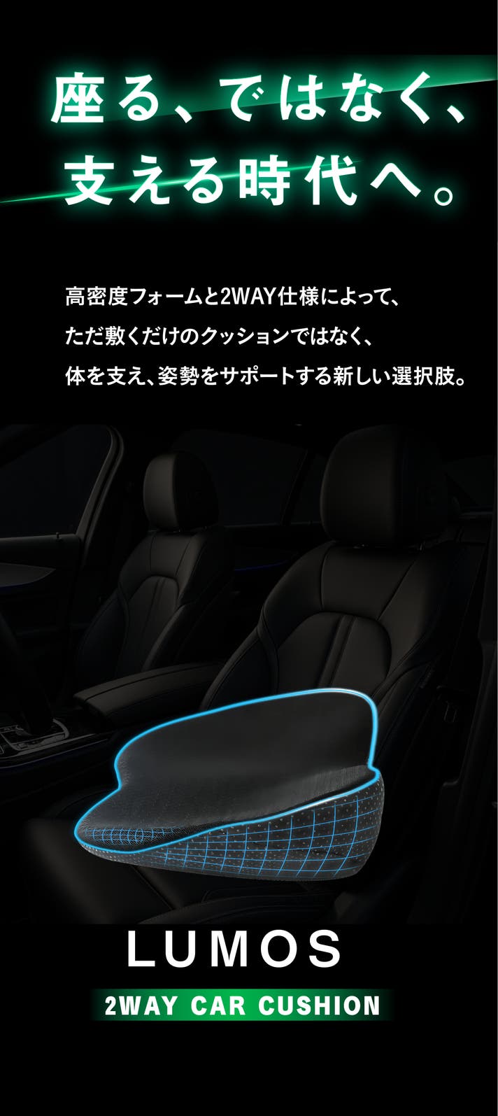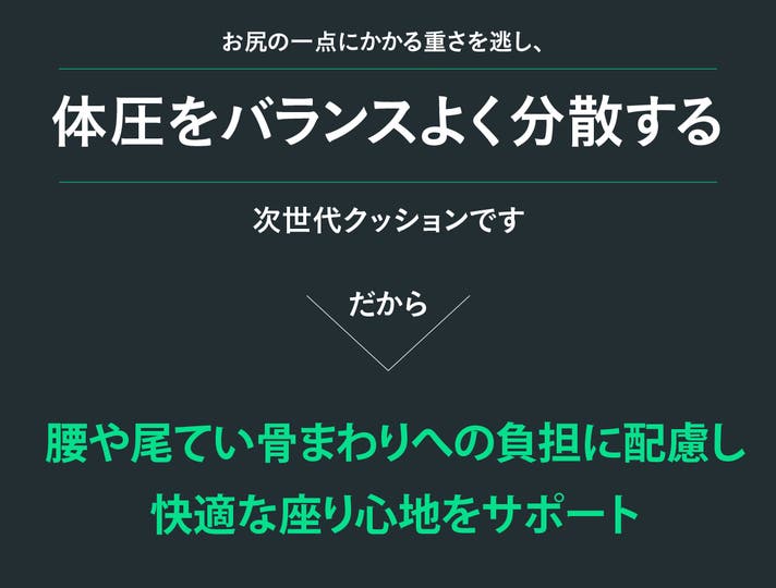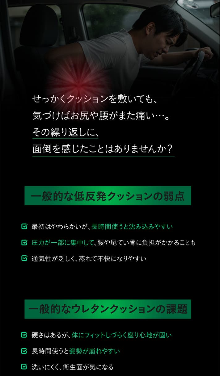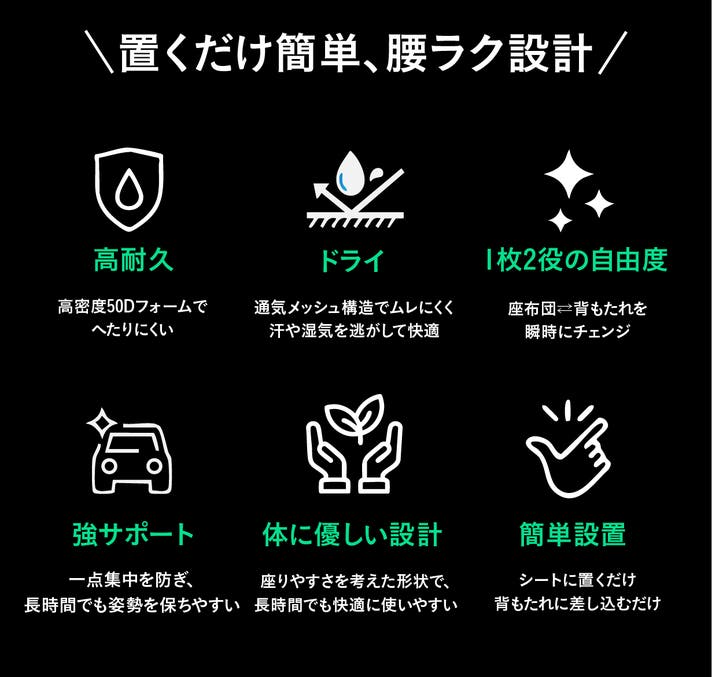 - 運転中の腰やお尻にかかる重さを分散。体圧分散設計で、長距離ドライブの快適な座り心地をサポート。