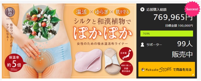 2023年4月にMakukae様にて先行予約販売をした『シルクと和漢植物の吸水まいにちライナー』は多くの方から応援を頂き、目標金額を大きく越える応援購入金額で769%の達成となりました!