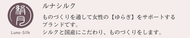 私たちルナシルクは、ものづくりを通して、女性特有の【ゆらぎ】をサポートすることを目標とし、シルク素材と日本生産にこだわった商品を企画開発するブランドです。