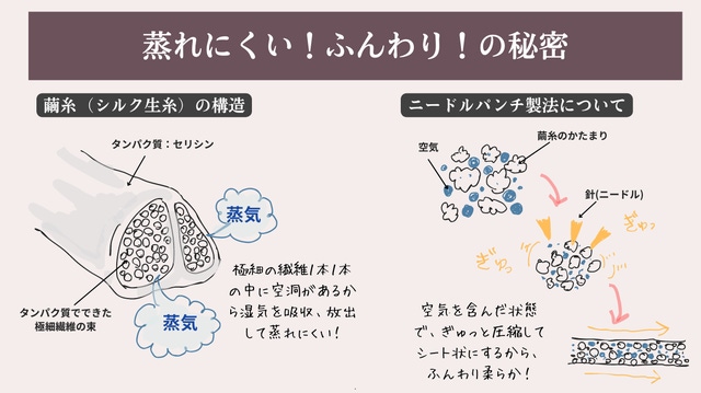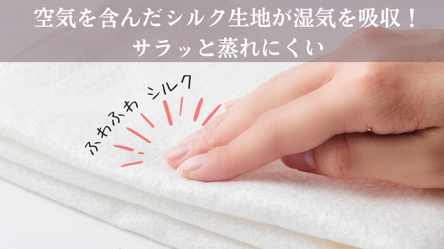 中空繊維であるシルクと、空気を含んだ製法によって、湿気がこもりにくく蒸れにくいので、快適な着け心地です。