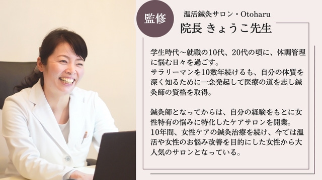 温活・女性のお悩みを専門とする鍼灸院の院長きょうこ先生に、商品の企画段階から監修アドバイザーとして参加して頂きました。