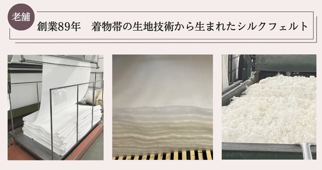 『シルク100%フェルトのおりものシート』に使用しているシルク生地は、長年、着物の帯の芯地を生産してきた経験を活かして岐阜県にある創業89年の服飾生地の専門工場さんが生んだ独自の生地です。