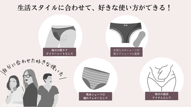 毎日使いたい方、ブルーデーだけ使いたい方、吸水ショーツの補助として....等、お好みでご利用できます。