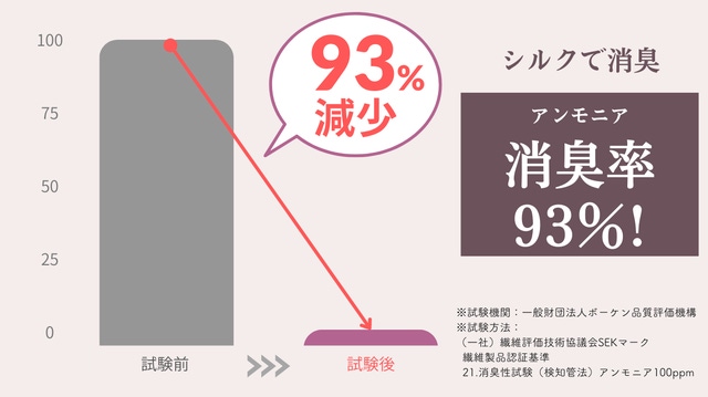 シルク自体が持つ消臭機能を活かし、薬剤や特殊な加工を使用せず、天然繊維だけで、気になるアンモニア臭を93%消臭する機能を実現しています。