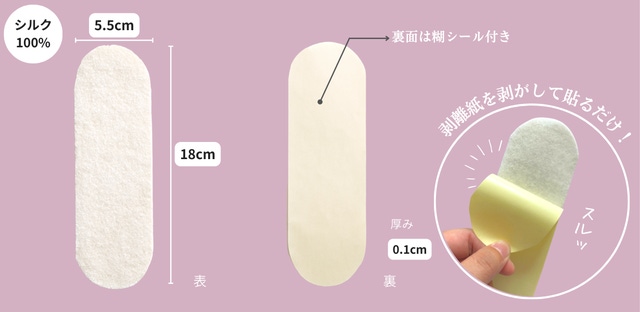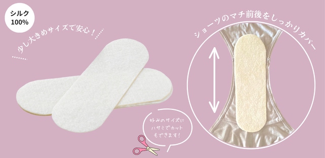 シルク100%を使用した、ショーツに貼って使用するタイプのおりものシートです。
