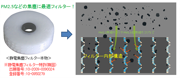 すべての物体は原子で構成されていて原子は電気的性質を持っています。PM2.5微細ホコリやPM1.0超微細ホコリなども電気的性質(極性:+)を持っています。お互いに違う極性が出会えると引き寄せる力が発生します。本静電気集塵フィルターはフィルターに電気を注入し、自体的に(-)極性を含んでいます。上記の図のようにそのフィルターを通過するホコリの電気的性質(+)を引き寄せてくっつく原理です。より小さいほこりの方が軽くてそのフィルターに吸着しやすいです。