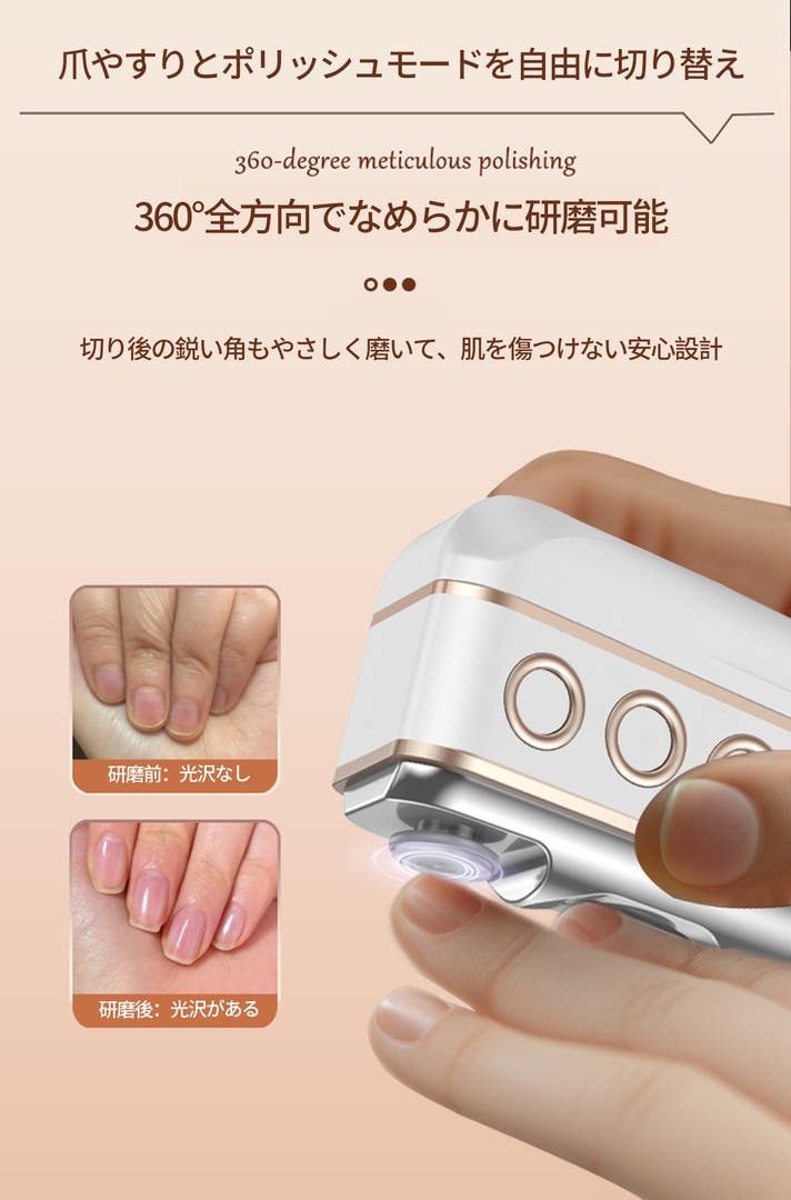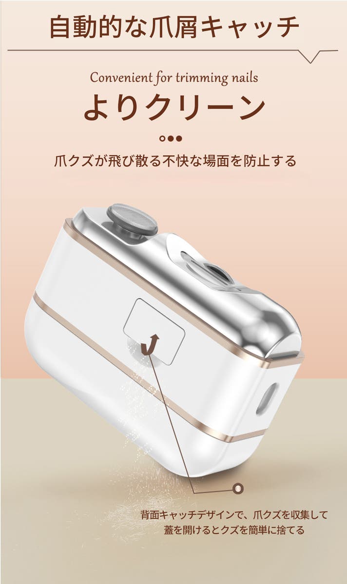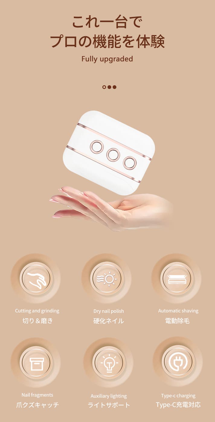 ・これ一台で爪切り・磨き・除毛・UV硬化までオールインワン。爪カスもまるごと自動回収。面倒な手間を最小限におさえます。