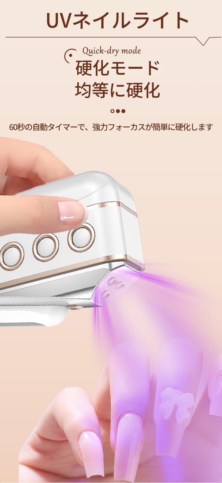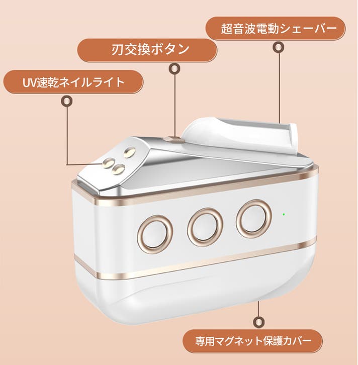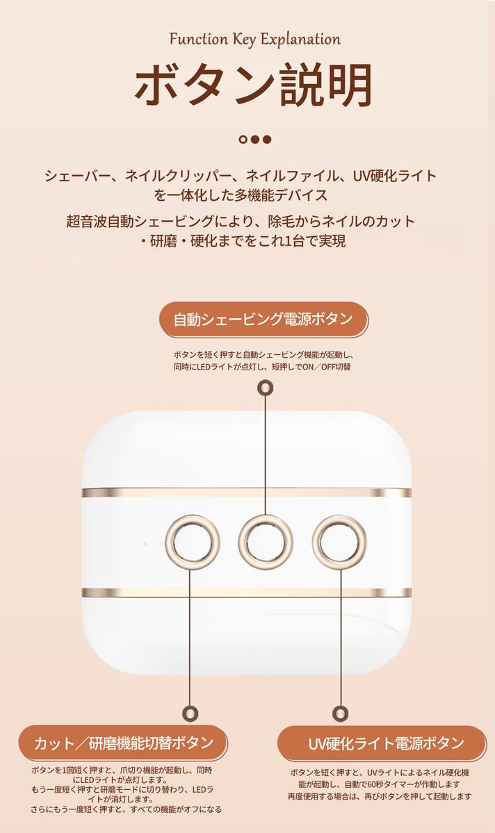 この多機能ネイルケアデバイスは、電動爪切りによる均一なカット、複数の研磨ヘッドでの細かなネイルケア、さらにセルフジェルネイルに欠かせないUVライトによる硬化機能まで搭載しています。加えて、除毛に使える振動式のシェーバーや、細部作業を見やすくするLEDライトも備えており、1台でさまざまなケアが完結します。