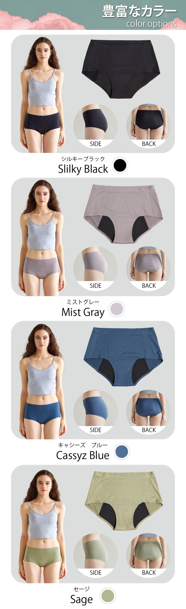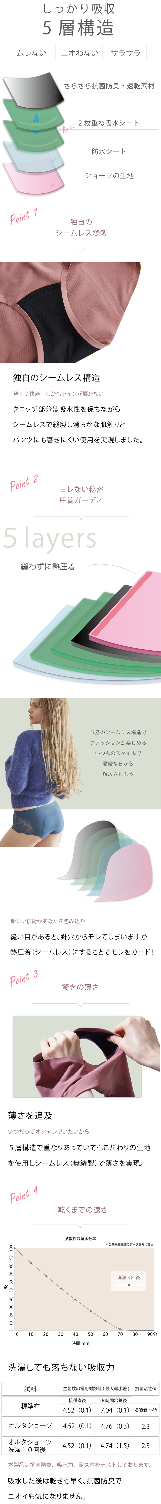 - 吸水機能性バツグンの5層構造でサラサラ。シームレス縫製で液体を通さないのに通気性◎