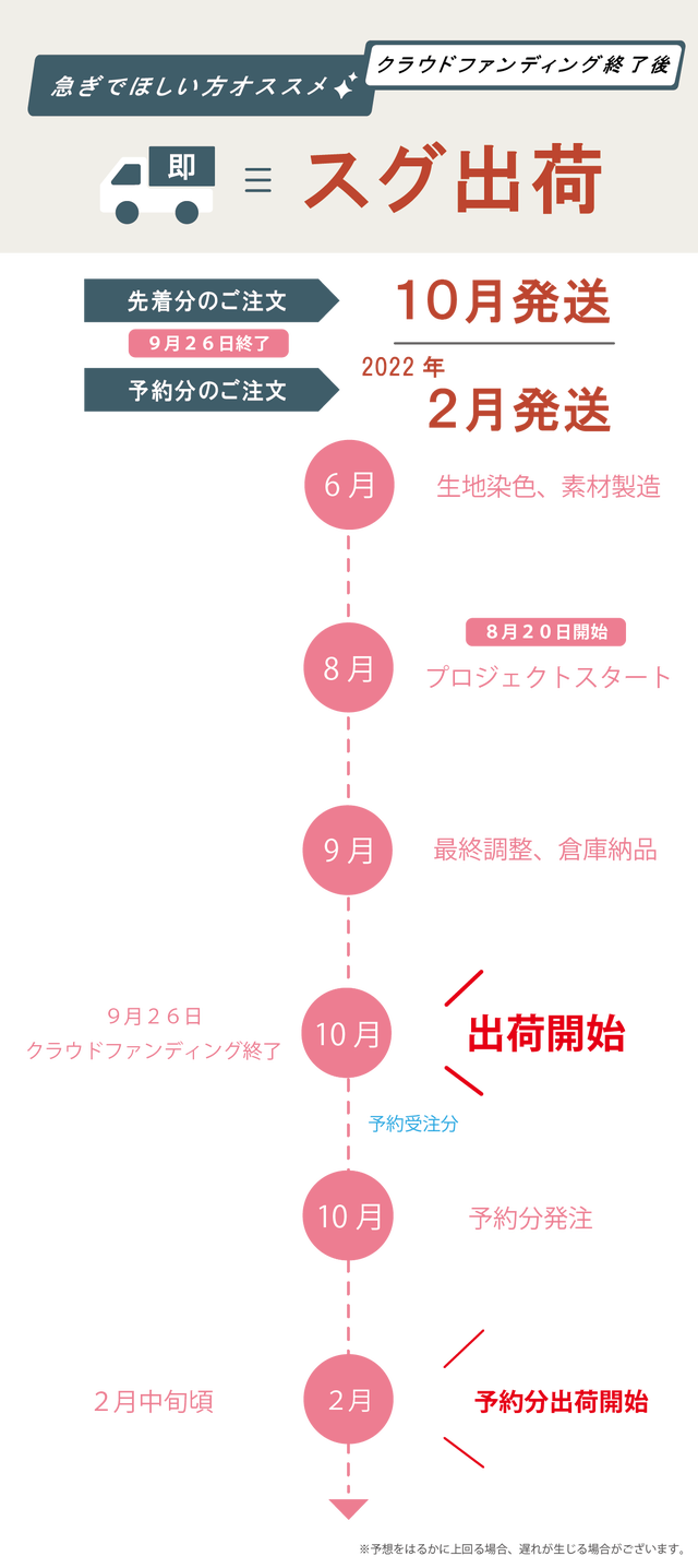本文中に記載させていただいたスケジュールは、あくまでプロジェクト公開時点の予定です。 応援購入の性質上、配送遅延のおそれがございます。 原則として、配送遅延に伴う応援購入のキャンセルはできませんが、リターン配送予定月から 3ヶ月を超えた場合には、希望者に限りキャンセルにて対応させていただきます。 ※生産に関して一部変更になることがございます。機能に関しては変更ございません。 ※本プロジェクトページにおいて内容の変更が生じた場合には、速やかに活動レポートにて報告いたします。 ※製造スケジュールに関しまして想定を上回った場合、出荷に遅れが生じる場合がございます。 ※ご利用のモニターにより実際の色合いと異なって見える場合があります。 ※生地変更などにより一般販売価格が予定している価格から変更となる場合がございます。 ※商品との相性や、使用感には個人差があります。初めはご自宅でお試し頂くことをおすすめします。