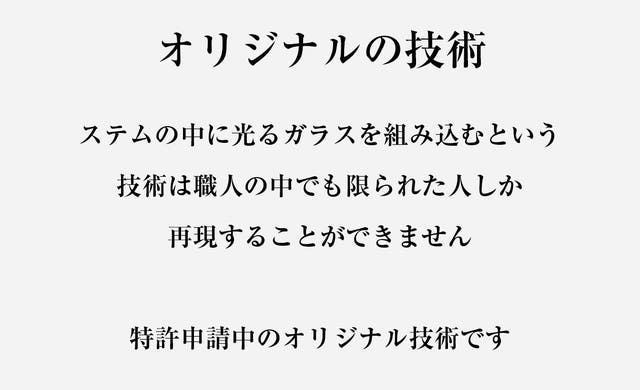 ステムが光る仕組みについてはワイングラスを開発中に偶然発見しました。 大前提として薄さ、細さ、重さ、形状 全てにおいて一定のクオリティを安定的に 生産できるように品質向上や細かな変更を逐一行ってきました。 一脚ずつ職人が手作りで生産しているためどうしても時間がかかってしまうことがあります。 品質管理、検査基準など心から納得できたものだけをサポーターのみなさまに お届けできるように鋭意プロジェクトを進めてまいります。 ※本文中に記載させていただいたスケジュールは、あくまでプロジェクト公開時点の予定です。生産状況・天候・配送問題などで、輸送が遅延する可能性がございますので、ご留意ください。 ※応援購入の数が想定を上回った場合、製造工程上の都合等により出荷時期が遅れる場合がございます。 ※ユーザーの使用未熟による払い戻しは受けておりません。 ※使用感などに関しては、感じ方に個人差が予想される製品でございます。そのため、使用感等に関する返品・返金はお受けいたしかねます。 ※全品出荷前にチェックを行い、使用上は問題ないレベルはクリアしてはおりますが、ハンドメイドという性質上、グラスにわずかな歪みなどがある場合もございます。何卒ご理解のほどお願いいたします。 ※一部国内に類似品が出回っている可能性がございます。 弊社では他社の類似品に関してのお問い合わせには対応できませんので、ご了承ください。弊社商品のオリジナル性については、上記プロジェクトに関する情報をご覧ください。 本文中に記載させていただいたスケジュールは、あくまでプロジェクト公開時点の予定です。 応援購入の性質上、配送遅延のおそれがございます。 原則として、配送遅延に伴う応援購入のキャンセルはできませんが、 リターン配送予定月から 1ヶ月 を超えた場合には、希望者に限りキャンセルにて対応させていただきます。
