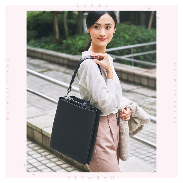 弊社オリジナルブランド「Luxas」のバッグは人気の薄マチ縦型バッグを2つ付けたデザインで、女性のボディにしっかりと収まるコンパクトさと、資料のたくさん入ったA4ファイルや13インチ程度のノートPCがしっかりと入る丈夫なバッグです。