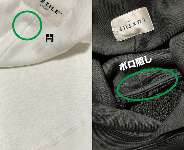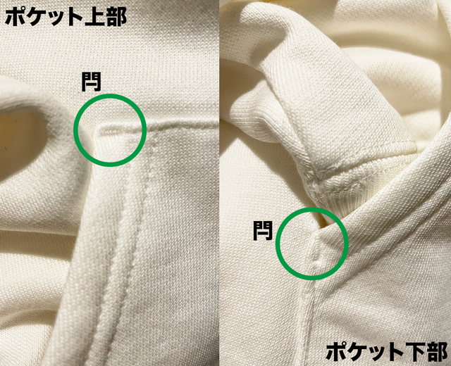 同様に首元後ろ(ボロ隠し)、フードの上部やポケット入り口に補強(閂止め)をしております。