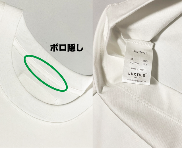首回りはロック接ぎをステッチで止め、首元後ろ(ボロ隠し)も上質さが増す様にクリーンな縫製仕様。品質表示もしっかりと。