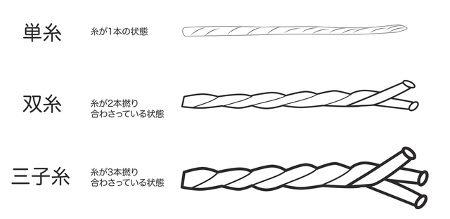 そのコンパクトヤーンを三子糸(みこいと)といって、糸を3本撚り合わせて1本の糸にしており、通常の単糸(たんし)、糸が1本で作られているものと比べて格段にしっかりと安定した糸を作りました。