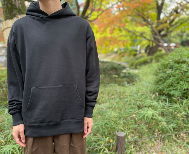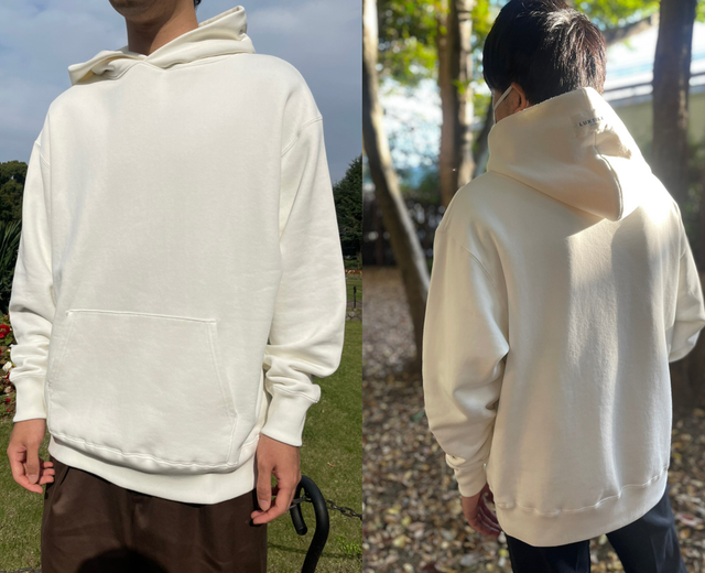 *秋冬向けのフーディーですと、よく裏側が起毛されているタイプ(裏起毛)がございます。暖かく真冬に活躍することは間違いありませんが、裏毛を掻いて毛を立たせるわけであり、むしれたり抜けたりといったデメリットもあるため、プロジェクトメンバーはあまり好まず、裏起毛を今回は採用しておりません。