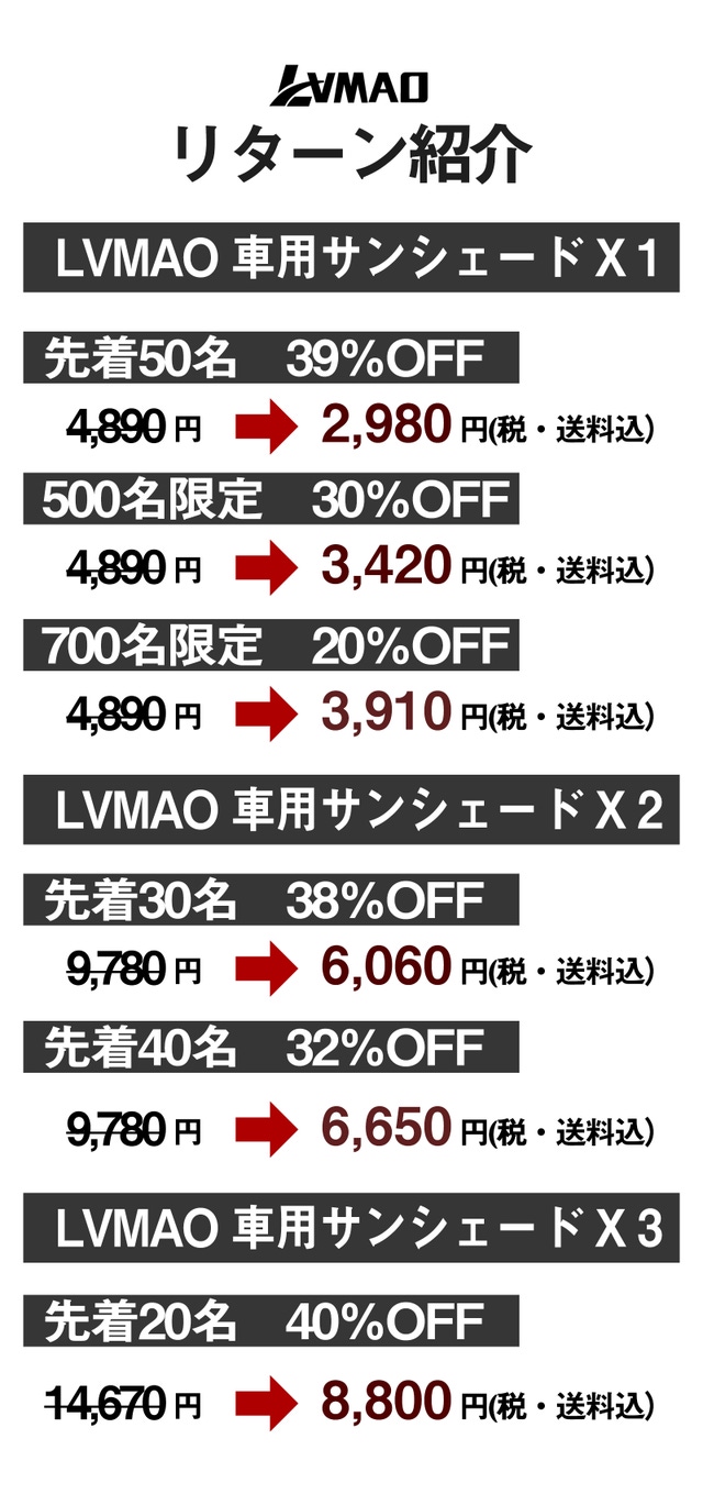 リターン品の配送が完了するまで、弊社はLVMAO車用サンシェードの日本における独占販売権を有する正規代理店です。詳細に関しては、ページ下部のリスク&チャレンジをご確認ください。