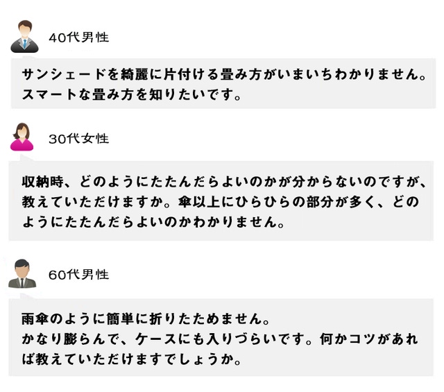 去年、弊社の【LVMAO】傘型サンシェードをご愛用いただいているお客様から、いくつかのご意見や声をいただきました。「畳み方が分からない」「綺麗にしたい」というお声が多く寄せられました。