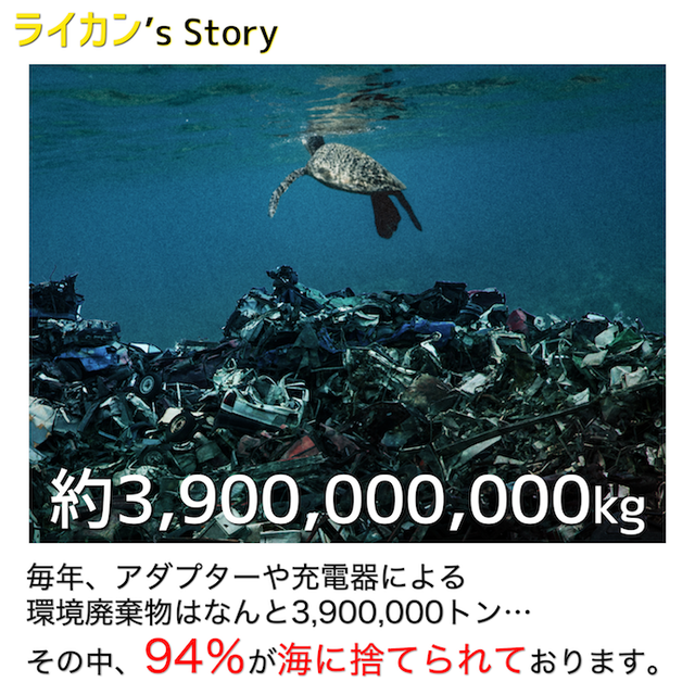 ダイビング歴10年。ダイビングマニアのライカンのCEO・ミョンは、技術の発達につれ、急速に増えていく海洋ゴミの現実を目の前にし、その深刻さを実感しました。人間の生活の中で電子機器は欠かせない…だが、これ以上ゴミを増やしてはいけない。その根本的な原因を一部生み出しているメーカーとしてほんの少しでも役に立てることはなんなのか今我々にできるのは、取りあえず、プラスチック製品を減らすことだと気付きました。複数の充電器を1台にまとめることができれば、少しでもプラスチックゴミを減らすことができ、プラスチックゴミで苦しんでいる地球と動物たちを救えるだろうと!これをきっかけにライカンは今回の商品を開発することになりました。