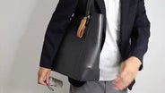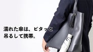 傘をレザーバンドにピタッ!と吊るして、カラビナリングをバッグに掛ければ、濡れた傘をスマートに携帯できます。