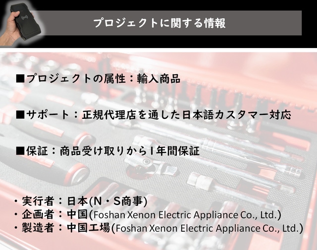 本製品はFoshan Xenon Electric Appliance Co., Ltd.の製品を日本国内にて販売する独占販売契約を弊社N・S商事と締結し現在海外で販売がされている製品をプロジェクト終了後皆様のお手元へ発送いたします。 生産国が海外である為、本国でのロックダウン等で清算スケジュールが遅延する等、商品製造に関しての状況はレポートにて予めご連絡致します。 万が一リターン発送予定月から6か月を超える様な遅延が発生した場合、希望者様のキャンセルはご対応させて頂きます。 同規格帯の製品にて一部SPECを偽装した製品は国内でも出回っておりますがそれらの製品に関する問い合わせ等には回答出来かねますのでご了承下さい。 ・プロジェクトの属性:輸入商品 ・代理店によるサポート:購入後は日本国内サポート 販売代理店N・S商事による1年補償となります ・実行者(国):日本 ・企画国:中国 ・製造国:中国 ※使用感等に関する返品・返金はお受けいたしかねます。 ※開発中の製品につきましては、デザイン・仕様が一部変更になる可能性もございます。 ※応援購入の数が想定を上回った場合、製造工程上の都合等により出荷時期が遅れる場合がございます。 配送に遅れが生じる可能性が判明した場合、直ちにご報告させていただきます。 ※本プロジェクトを通して想定を上回る皆様から応援購入頂き、現在進めている環境から量産体制を更に整えることができた場合、正規販売価格が販売予定価格より下がる可能性もございます。 ※本プロジェクトの実施において十分確認は行なっておりますが、並行輸入品が発覚する可能性がある点、ご了承願います。 ※並行輸入品は正規代理店による製品保証を受けることができません。 また、正規代理店を通じて購入することで、日本国内での流通に必要な各種認証の取得や、関税の適切な処理が担保されます。 ※本文中に記載させていただいたスケジュールは、あくまでプロジェクト公開時点の予定です。応援購入の性質上、配送遅延のおそれがございます。