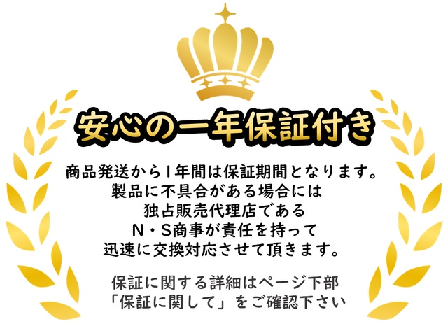 当社日本国内倉庫より商品を発送してから1年間(代理店N・S商事による保証)