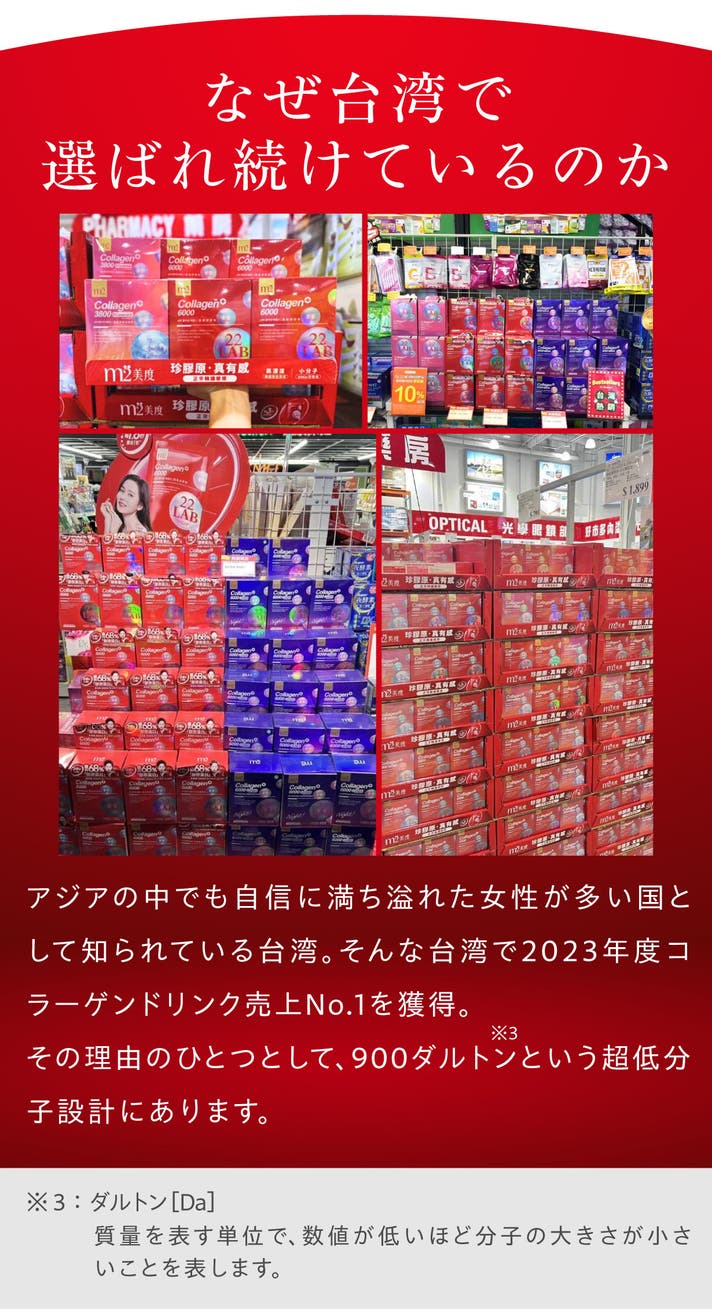- 台湾で累計販売5000万個!特許技術による900ダルトンの超低分子コラーゲンでしっかり届く