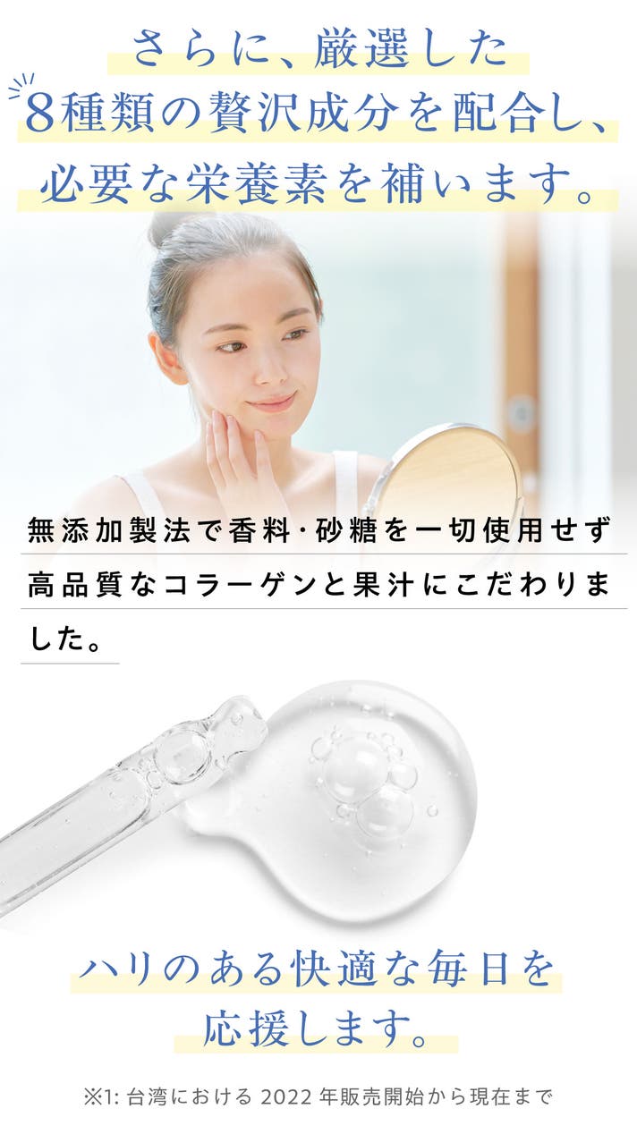 - 無添加製法で香料・砂糖を一切使用せず、高品質なコラーゲンと果汁にこだわりました。