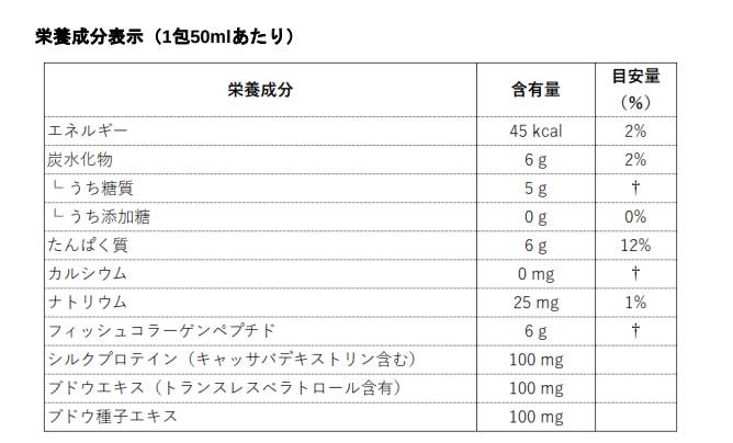 ● 原材料名:水、フィッシュコラーゲンペプチド、濃縮ピーチ果汁、濃縮リンゴ果汁、ストレプトコッカス発酵物(ヒアルロン酸ナトリウム含有)、クエン酸、DL-リンゴ酸、シルクプロテイン(シルクプロテイン、キャッサバデキストリン)、ブドウ抽出物(トランスレスベラトロール含有)、ビタミンC、こんにゃく粉、玄米抽出物(セラミド含有)(コーンデキストリン、ライスエキス)、ザクロ抽出物(ザクロ抽出物、マルトデキストリン)、トマト抽出物、酵母濃縮粉末(シリカ含有)、サケ抽出物(マルトデキストリン、サケ抽出物)