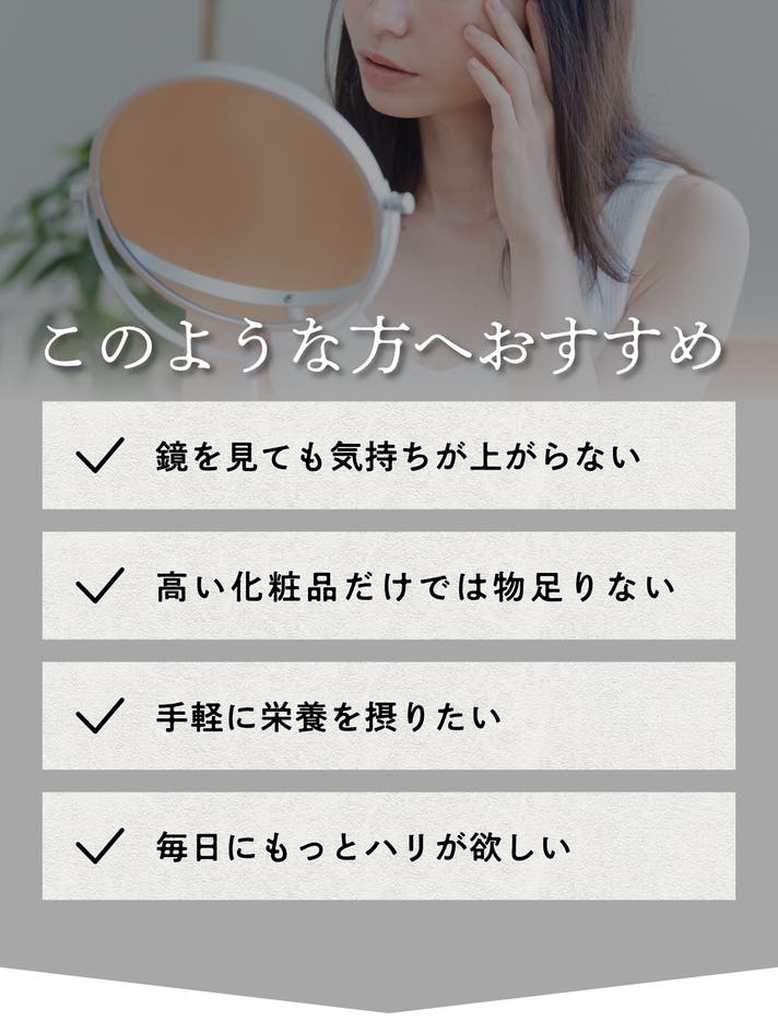 - 韓国産高品質コラーゲン5,900mgと日本産シルクペプチド100mgに加え8種の贅沢成分配合
