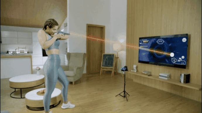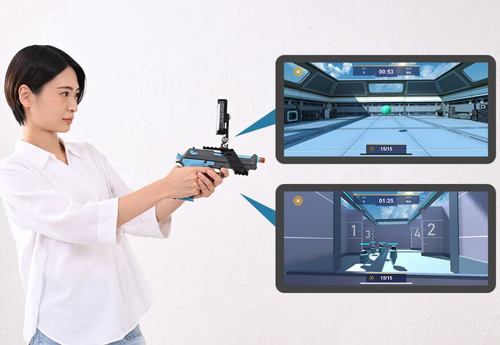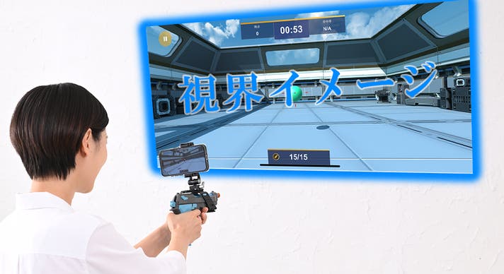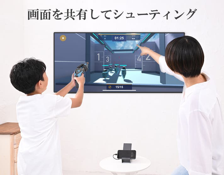 TVやプロジェクターなどにアプリ画面をミラーリングし、銃口から放たれる赤外線ので着弾を認識します。