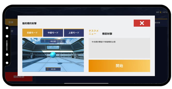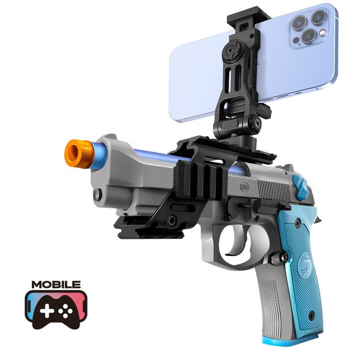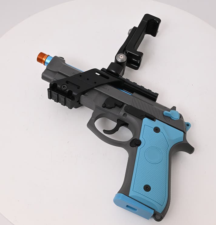 専用スマホホルダーを銃にセットして銃とスマホアプリを連動させます。